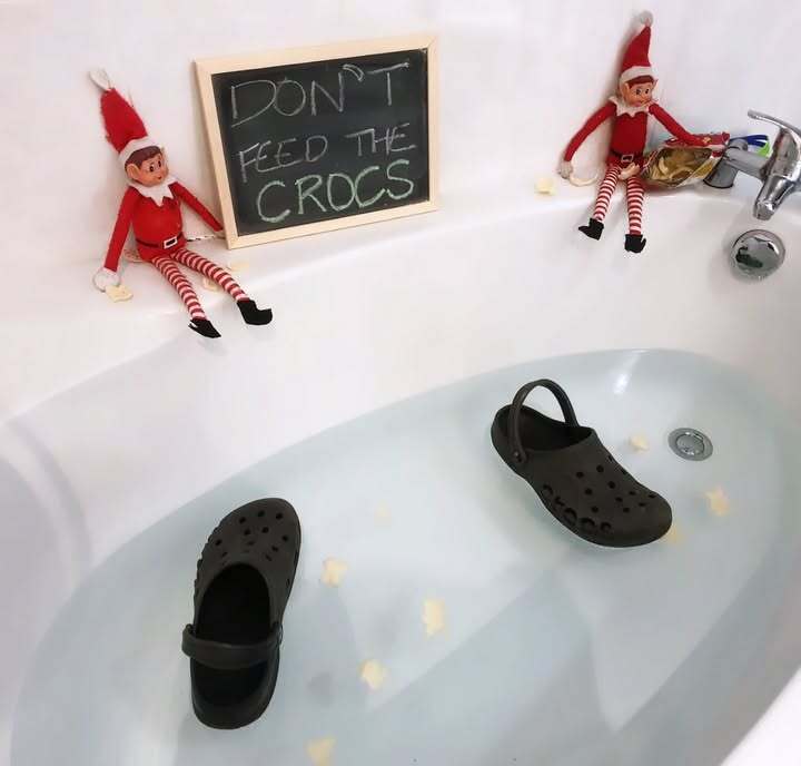 Uh-oh… looks like the elves have turned the bathtub into a wild crocodile lagoon — Crocs shoes and all!