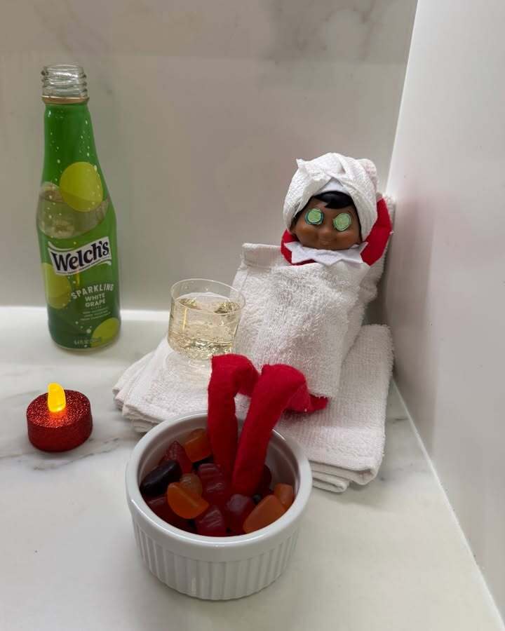 Your elf kicks back with a towel turban, cucumber eye pads, and the calmest vibe in the North Pole.
