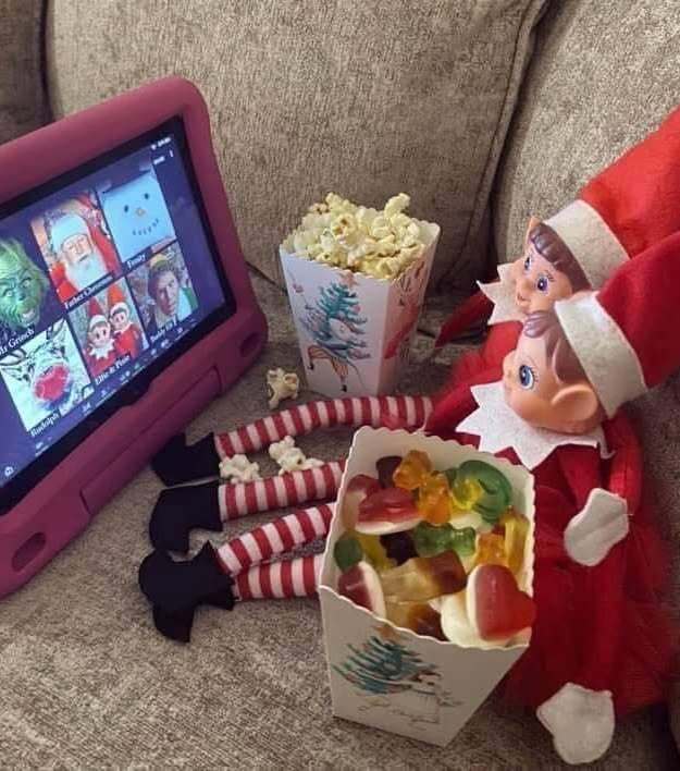 Your elves settle in with popcorn, a blanket, and maybe a tablet or mini “Now Showing” sign.