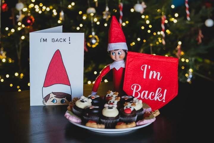 This setup is full of charm — tiny cupcakes, a handwritten “I’m Back!” sign, and your elf proudly waiting to greet everyone.