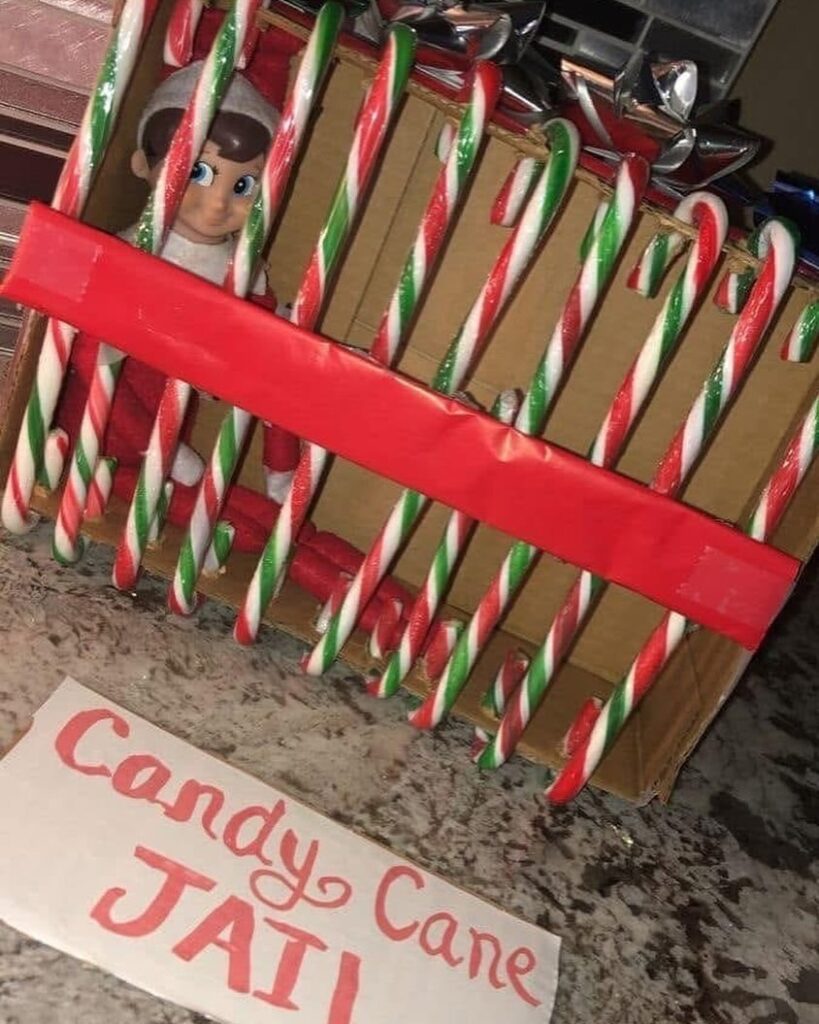 This setup turns candy canes into a mini jail cell, keeping your elf “locked up” while they plot their next festive move.