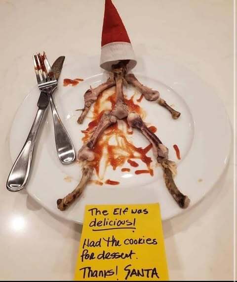 With chicken bones arranged like the elf’s body, ketchup “elf mess,” and a typed or handwritten message, this setup is pure over-the-top Christmas humour.