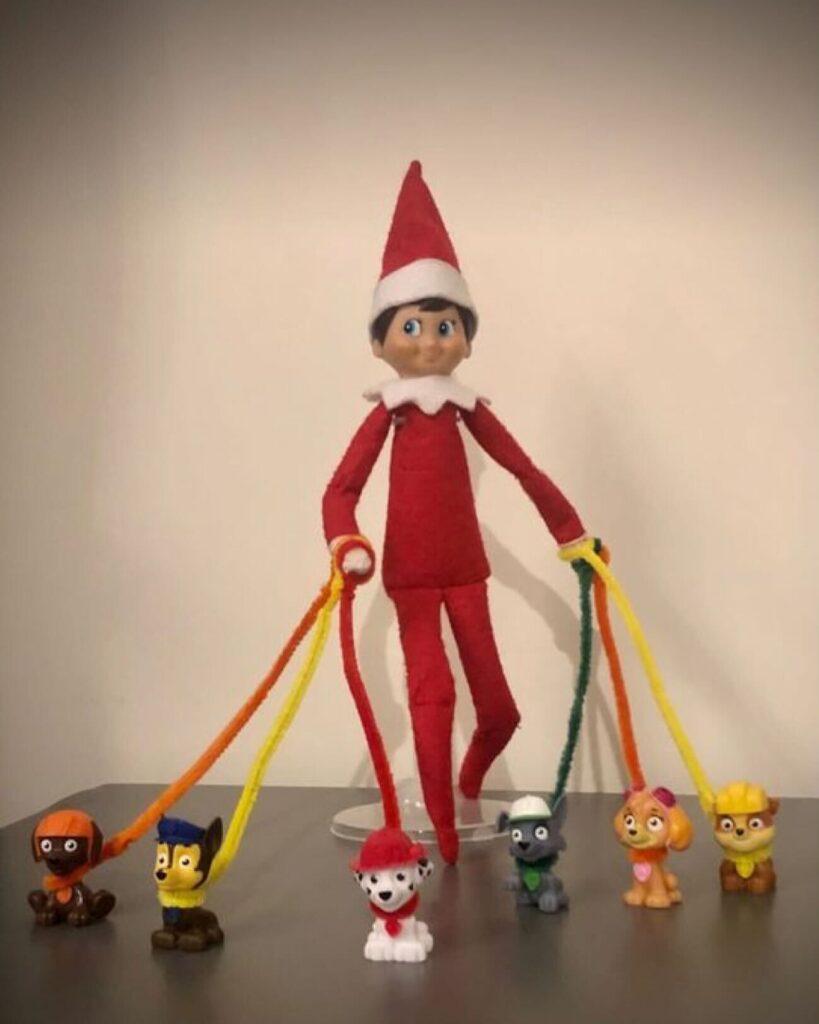 Your elf becomes a mini dog-walker, proudly taking their tiny toy pups out for a festive stroll around the house.