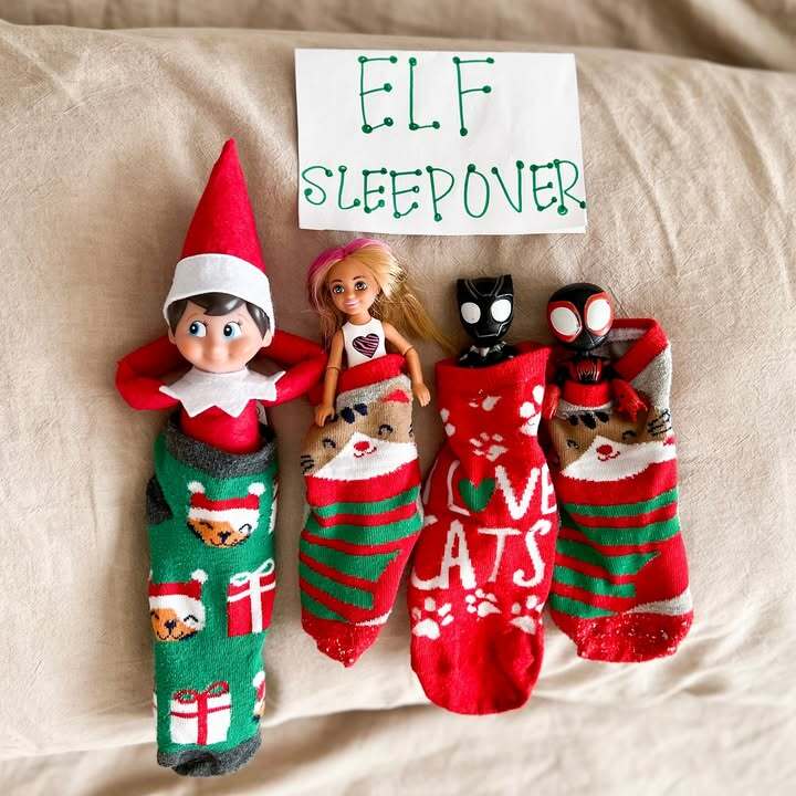 Your elf (and maybe a few toy friends) tuck into festive socks with a little handwritten “Elf Sleepover” sign above them.
