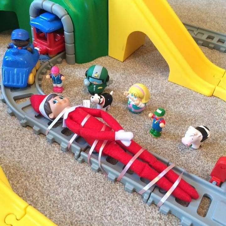 One brave elf has been tied to the toy train tracks while the other watches in shock (or perhaps… they’re the mastermind!).